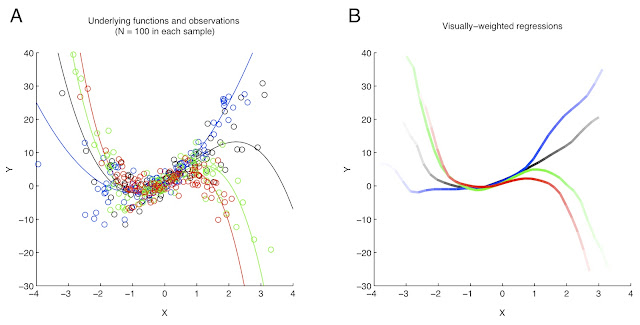"Visually-weighted regression" is a method for presenting regression results that tries to address issue (2), taking a normal person's psychological response to graphical displays into account. I had grown a little tired of talks and referee reports where people speculate about the cause of some strange non-linearity at the edge of a regression sample, where there was no reason to believe the non-linear structure was real. I think this and related behaviors emerge because (i) there seems to be an intellectual predisposition to thinking that "nonlinearity" is inherently more interesting that "linearity" and (ii) the traditional method for presenting uncertainty subconsciously focuses viewers attention on features of the data that are less reliable. I can't solve issue (i) with data visualization, but we can try to fix (ii).